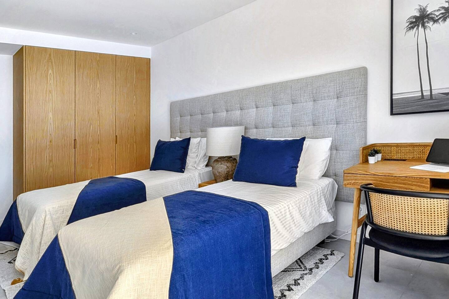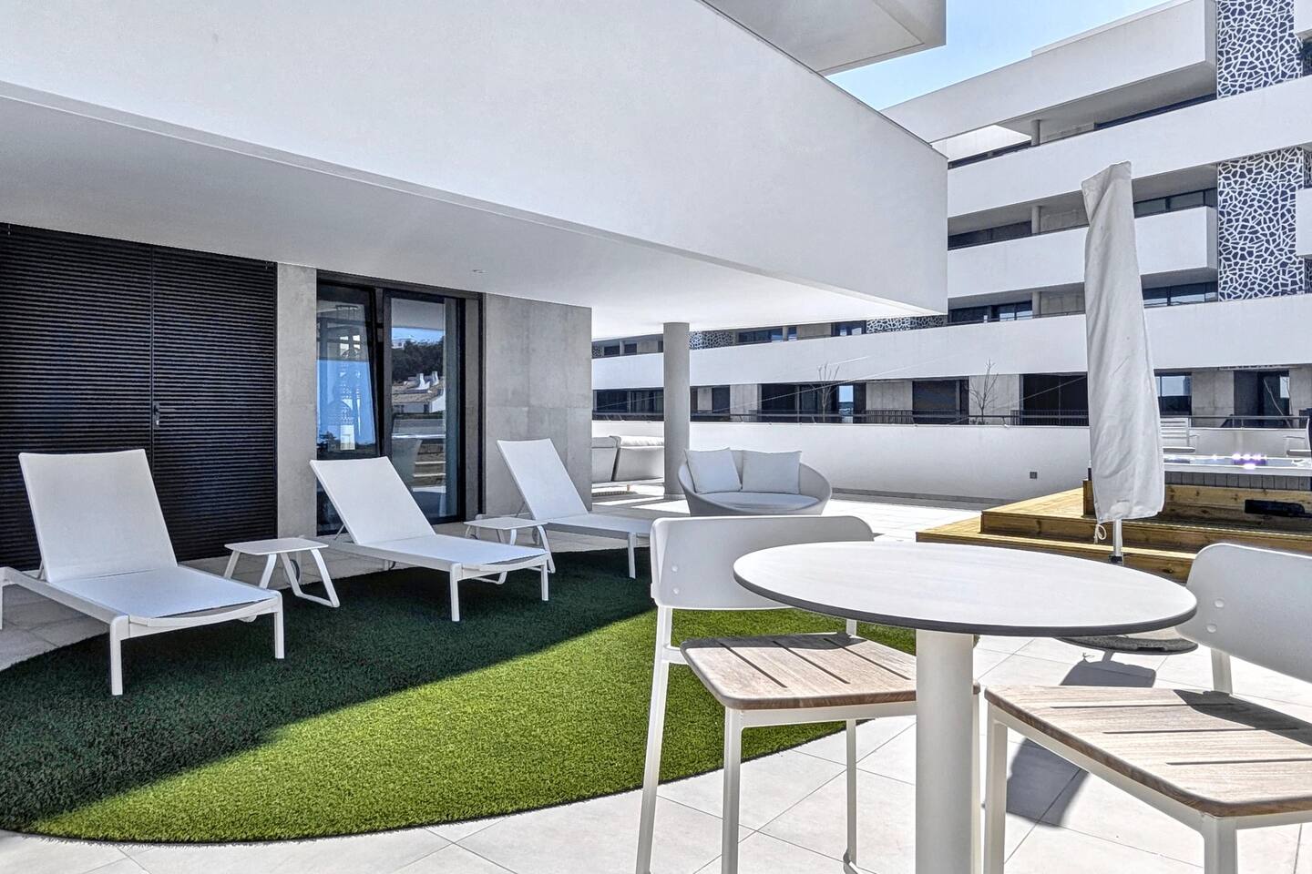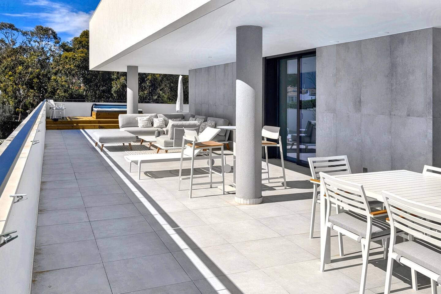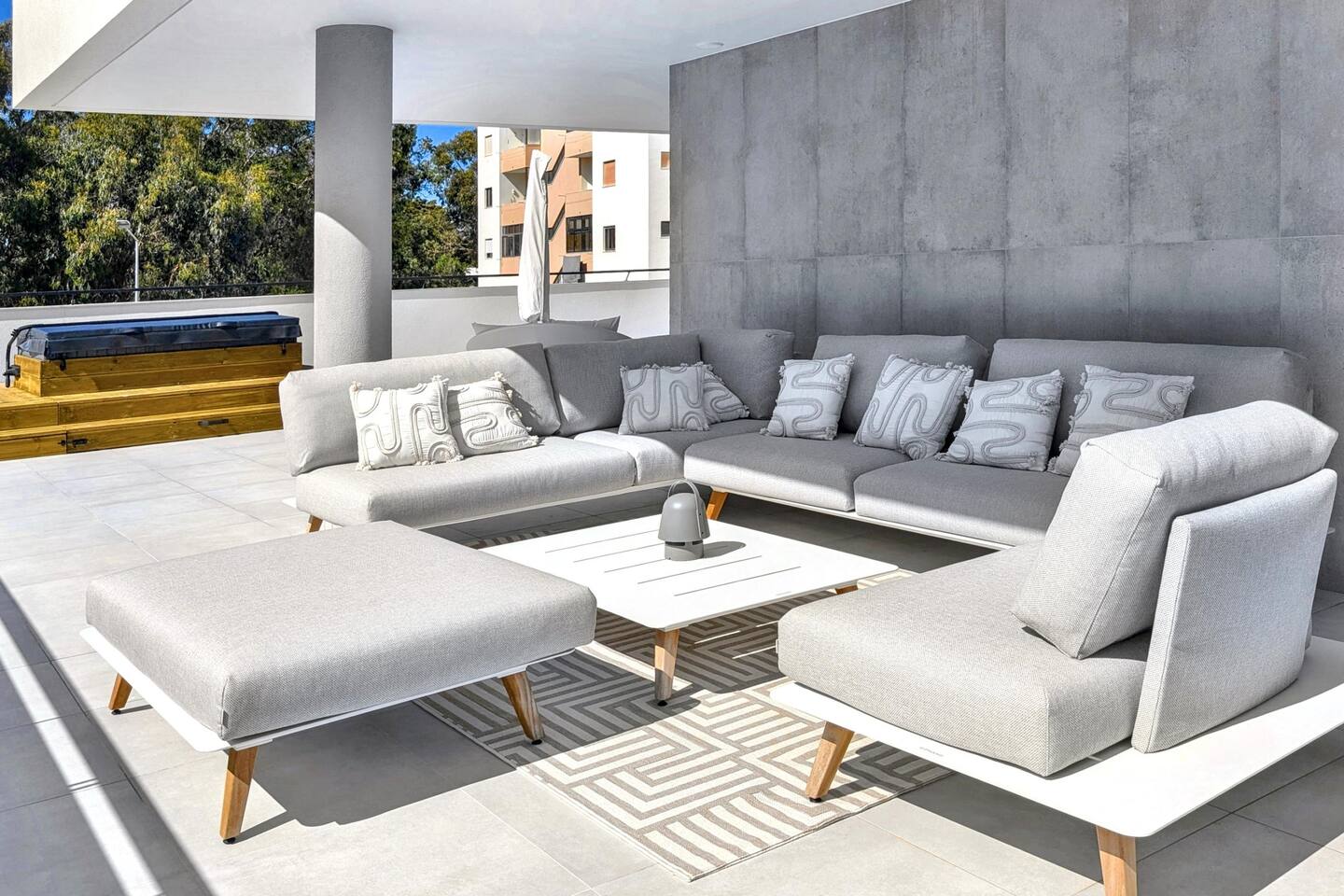 Algarve Escape features: 151 m2 (1750 ft2) interior | 3 bedrooms / 2 baths: king, king, 2 twin (can be converted to King) 160 m2 (1830 ft2) terrace | 3 zones – The Patio (dining), The Lounge, The Green (private jacuzzi) Amenities: community pool, children’s pool, gardens, gym, dry sauna, therapy room (out call massage therapist), jacuzzi (private terrace) Professionally designed space | high-quality furnishings Bright, airy corner unit with sunny western facing terrace from mid-morning each day. Partial sea view from The Green terrace. Fully stocked kitchen: Nespresso coffee| air-fryer |toaster|toastee grill | dishwasher | induction stove Fast 250 MBPS Wi-Fi Private washing machine & dryer 3 dedicated workspaces (primary bedroom, twin bedroom, and The Study) Interior spaces offer AC|Heating + underfloor heating Beach chairs and umbrellas for guest use Alexa audio devices for music and digital assistance. Blue tooth speaker for beach and terrace ambiance. 2 underground assigned parking|additional free off-street parking 7-15 min walk to Old Town & Marina 10 min walk to beaches < 5 min walk to neighborhood cafés and groceries 5 min walk to tennis and pickleball (paddle) courts (+€/$)