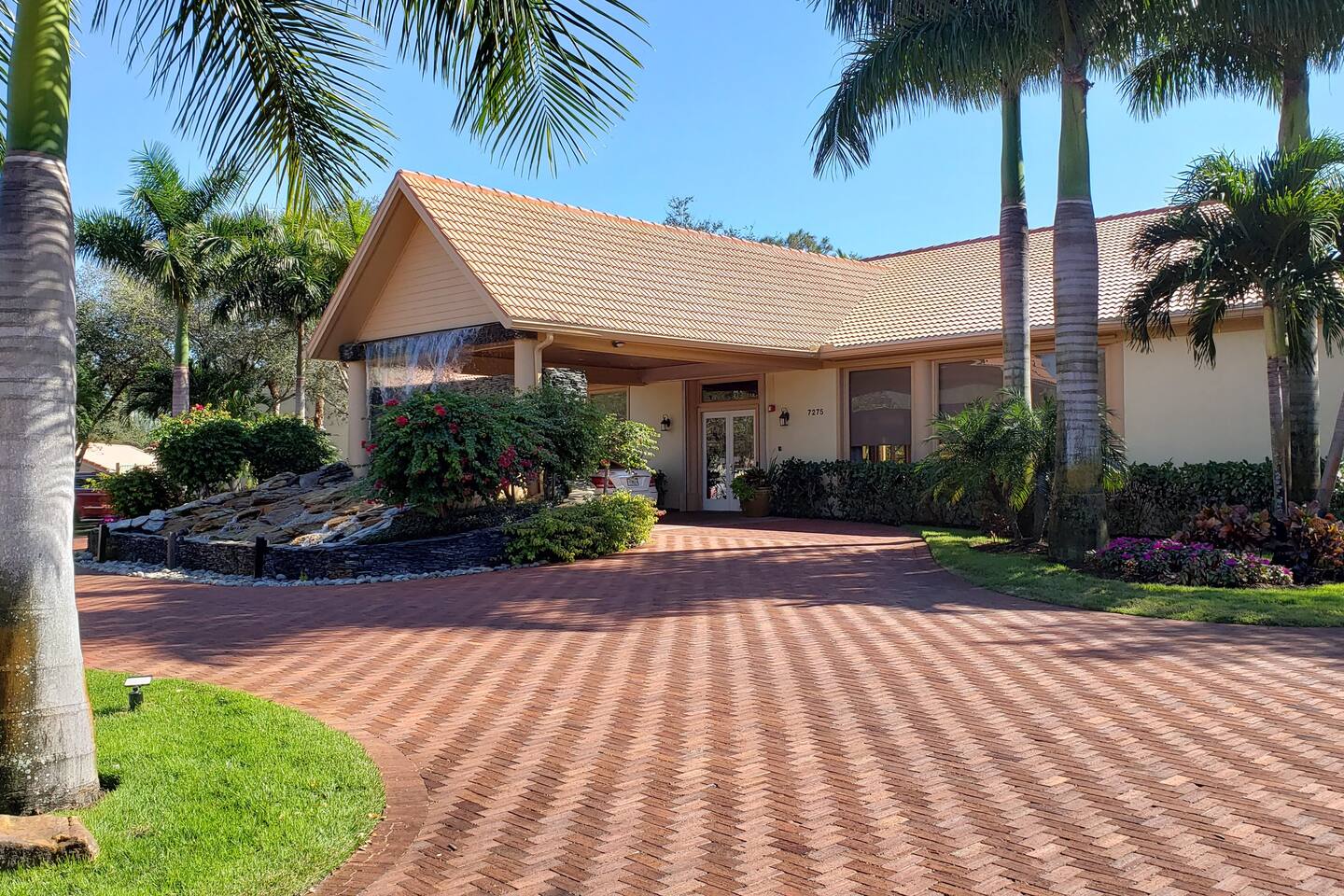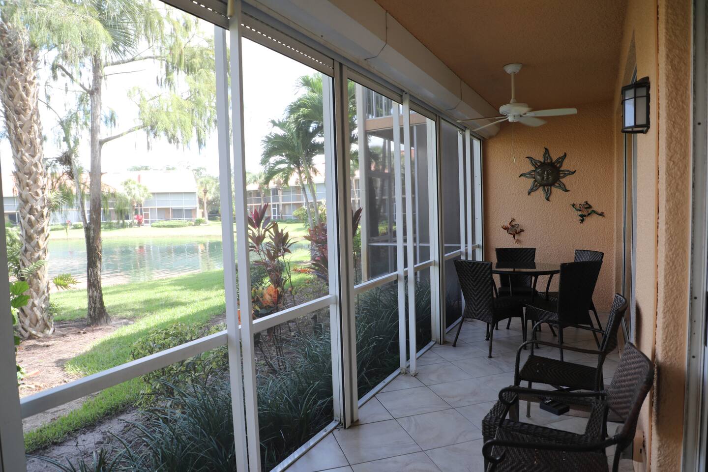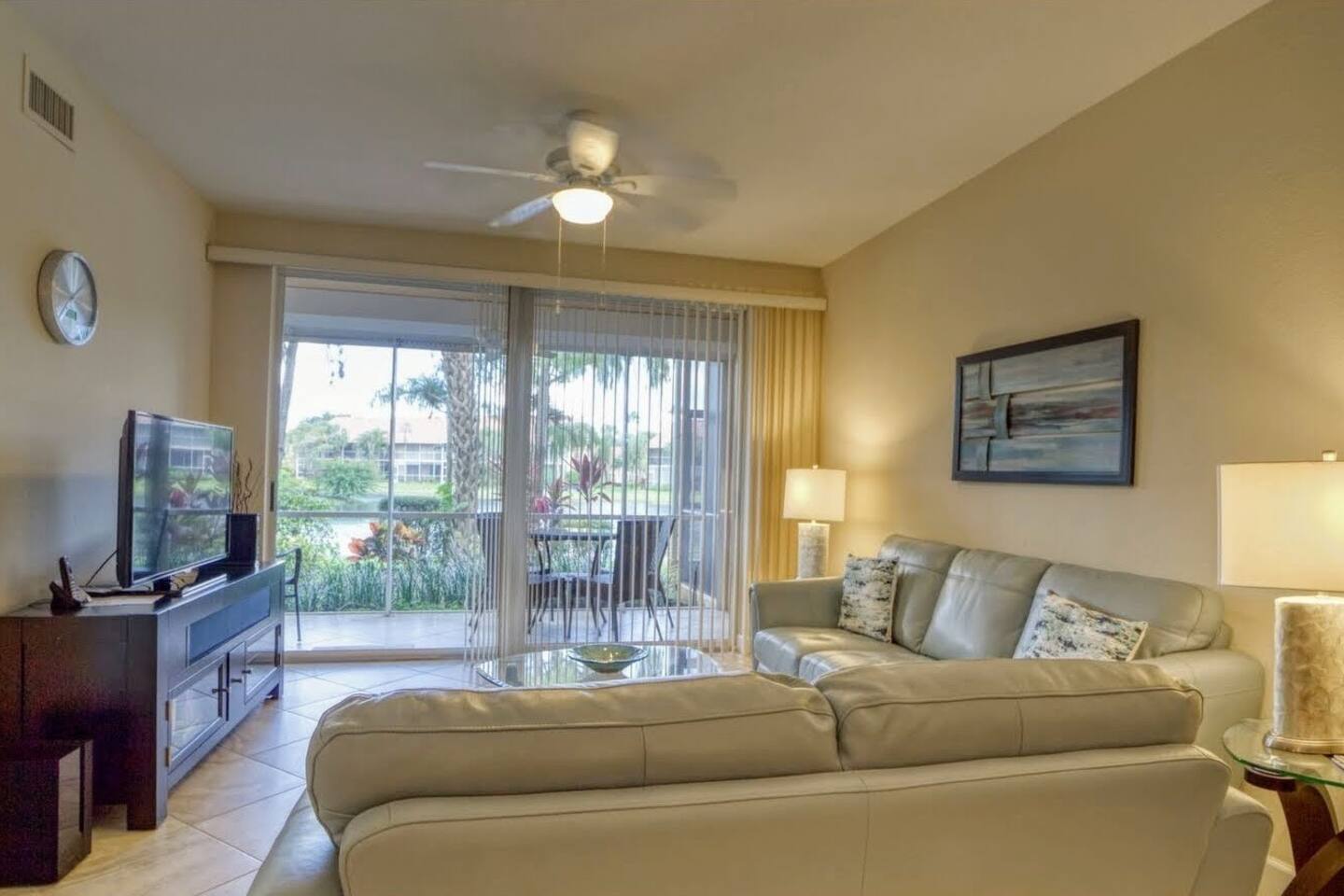 If you've been looking for the perfect getaway in Napes, look no further. 'Paradise Found' is ready to meet the needs of the most discerning guests. We purchased 'Paradise Found' in 2012 and completed a top to bottom renovation of the home the same year. In 2021, we completed an update of the living room furniture, bedding, and other furnishment ensure guest comfort. Its stately gated entrance gives way to a grand boulevard lined with trees, flowers and waterfalls leading to the home and its lakefront views. With a chef's ready granite and stainless kitchen and spa-like 2 headed walk-in shower with bench seating, we think you'll agree that 'Paradise Found' has everything you'll need for the perfect trip to Naples. Imagine the sun climbing over the palm trees and glistening off the lake as you sip your morning coffee on the expansive rear lanai. A 20 foot high fountain provides a soothing backdrop to the view of the private island complete with its own coconut, banana and bird of paradise vegetation. The island's lush foliage provides great shade for a late afternoon snack or glass of wine. Back at 'Paradise Found' you will enjoy a 2 BR / 2 BA 1351 sq ft under air with front (79 sq ft) and rear lanais (165 sq. ft) giving this end-unit villa lots of light and an airy feel. You'll love its walk in showers with invigorating rain shower heads with grab bars for easy access, 2 lanais (front and rear) for enjoying the tropical sights and sounds, and its contemporary yet comfortable furnishings including large screen flat paneled wall mounted televisions with surround sound. We've spared no expense to ensure that Paradise Found is ready to meet your perfect vacation wish-list. The unit has fast WIFI internet and unlimited long distance calling to keep in touch with friends and family. And when you are ready to step out of the villa, Falling Water's rich amenities are at your door. Its 13,000 sq. ft pool (one of largest in SW Florida) with waterfalls and islands is a great spot to relax, meet neighbors from around the world, and catch some sun. The clubhouse complex has 2 tennis courts and shaded / screened bocce courts. The 2.1 mile neighborhood walking / biking path is a great way to get some exercise. Outside of Falling Waters' gates lie Naples' superb amenities including world-class gulf beaches and shopping, arts centers, fishing and nature preserves all within 10 - 15 minutes drive. 5th Ave is within a short 10 min drive. We've been vacationers in Naples for over 15 years and we are confident that you are going to love Paradise Found not only for its luxury and comfort, but how easy it is to take advantage of all that Naples has to offer. We invite you to book your stay today! The unit has 2 BR / 2 BA. The master BR is a King Bedroom and offers an oversize walk in shower with grab bars, a stone bench, and 2 spa like rain shower heads. The guest BR can be configured as 2 twins or a king based on your preference. The guest bath includes a walk in shower with grab bar and sliding glass doors. We provide 4 beach chairs, umbrella and beach towels for your use along with 2 bicycles. We're happy to share our tips and recommendations in a booklet we'll leave for your reference. We're confident you'll love Naples as much as we do! Please note this is a 100% non-smoking unit including the exterior lanai. No smoking is permitted.