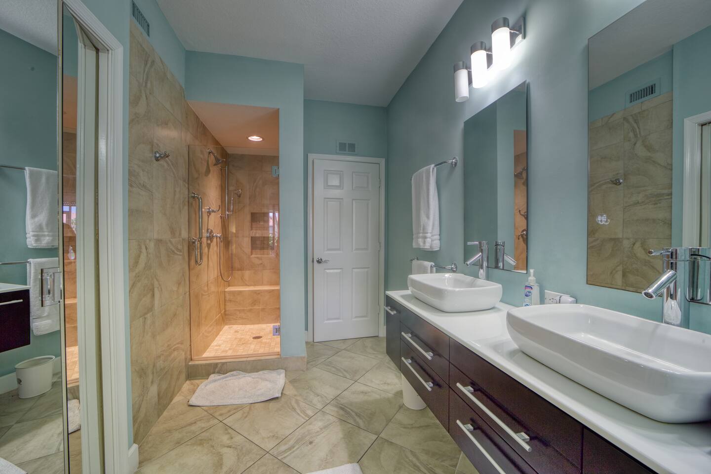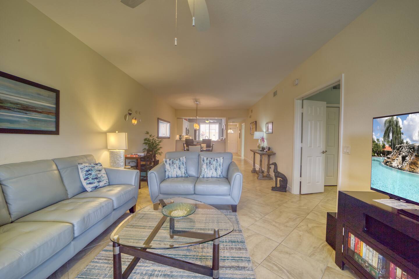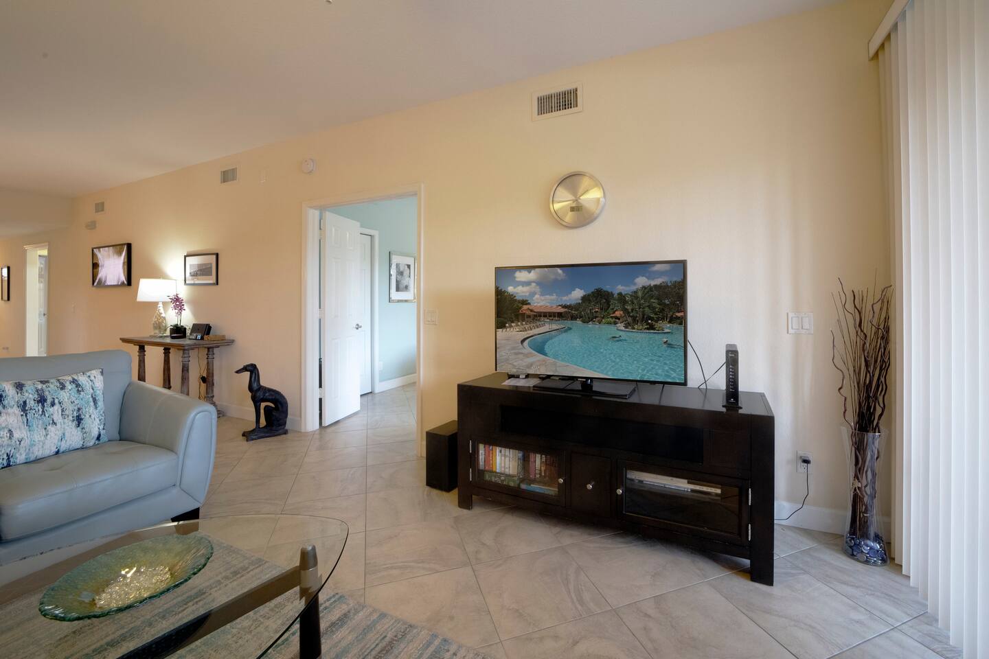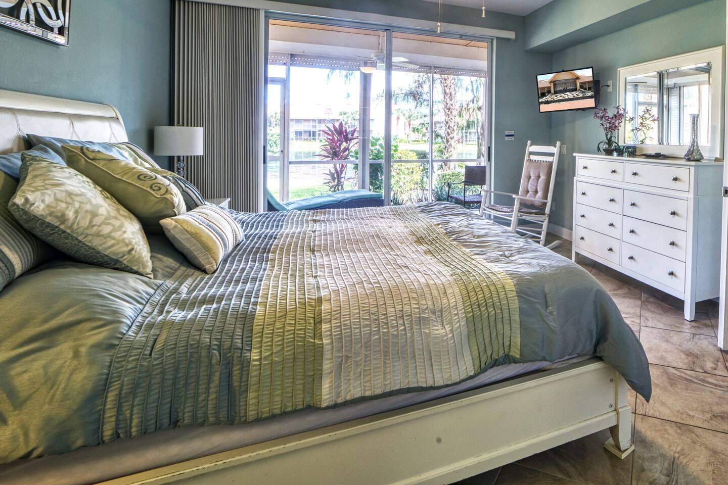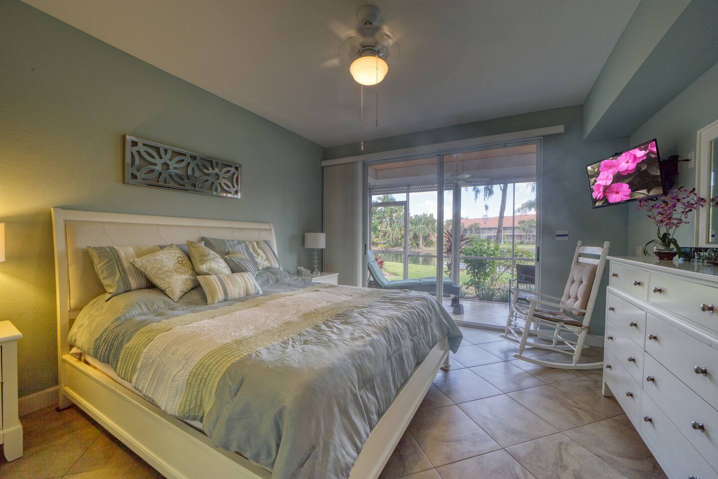 Imagine the sun climbing over the palm trees and glistening off the lake as you sip your morning coffee on the expansive rear lanai. A 20 foot high fountain provides a soothing backdrop to the view of the private island complete with its own coconut, banana and bird of paradise vegetation. The island's lush foliage provides great shade for a late afternoon snack or glass of wine. Back at 'Paradise Found' you will enjoy a 2 BR / 2 BA 1351 sq ft under air with front (79 sq ft) and rear lanais (165 sq. ft) giving this end-unit villa lots of light and an airy feel. The condo has a W Hotel vibe - cool coastal colors, pops of white and a relaxed but decidedly modern feel. You'll love its walk in showers with invigorating rain shower heads with grab bars for support, 2 lanais (front and rear) for enjoying the tropical sights and sounds, and large screen flat paneled wall mounted televisions with surround sound for the occasional break from the beach! We've spared no expense to ensure that Paradise Found is ready to meet your perfect vacation wish-list. The unit has fast WIFI internet and unlimited long distance calling to keep in touch with friends and family. And when you are ready to step out of the villa, Falling Water's rich amenities are at your door. Its 13,000 sq. ft pool (one of largest in SW Florida) with waterfalls and islands is a great spot to relax, meet neighbors from around the world, and catch some sun. The clubhouse complex has 2 tennis courts and shaded / screened bocce courts. The 2.1 mile neighborhood walking / biking path is a great way to get some exercise. The unit has 2 BR / 2 BA. The master BR is a King Bedroom and offers an oversize walk in shower with grab bars, a stone bench, and 2 spa like rain shower heads. The guest BR can be configured as 2 twins or a king based on your preference. The guest bath includes a walk in shower with grab bar and sliding glass doors. We provide 4 beach chairs, umbrella, beach towels and cooler for your use along with 2 bicycles. We're happy to share our tips and recommendations in a booklet we'll leave for your reference. We're confident you'll love Naples as much as we do! Please note this is a 100% non-smoking unit including the exterior lanai. No smoking is permitted.